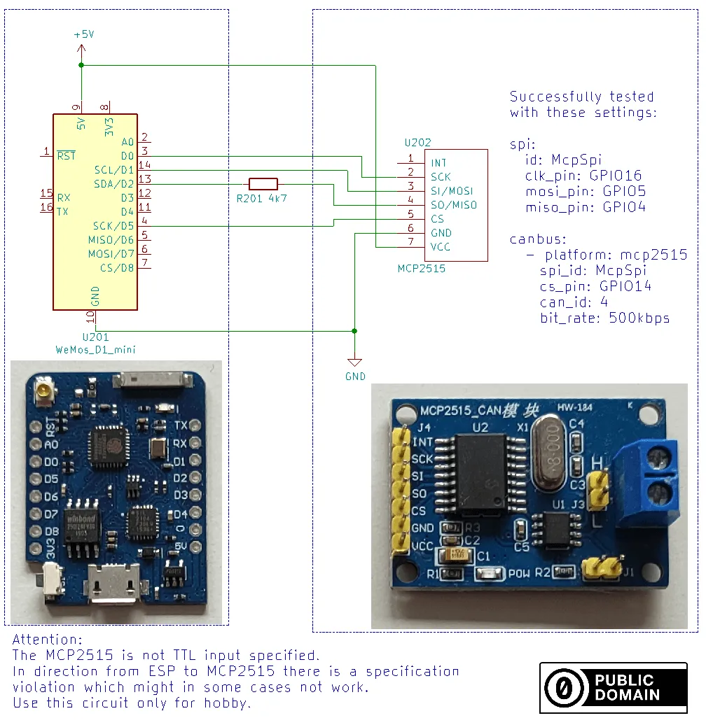 The MCP2515 communicates with ESPHome via the SPI bus; to use it, you must have at least one